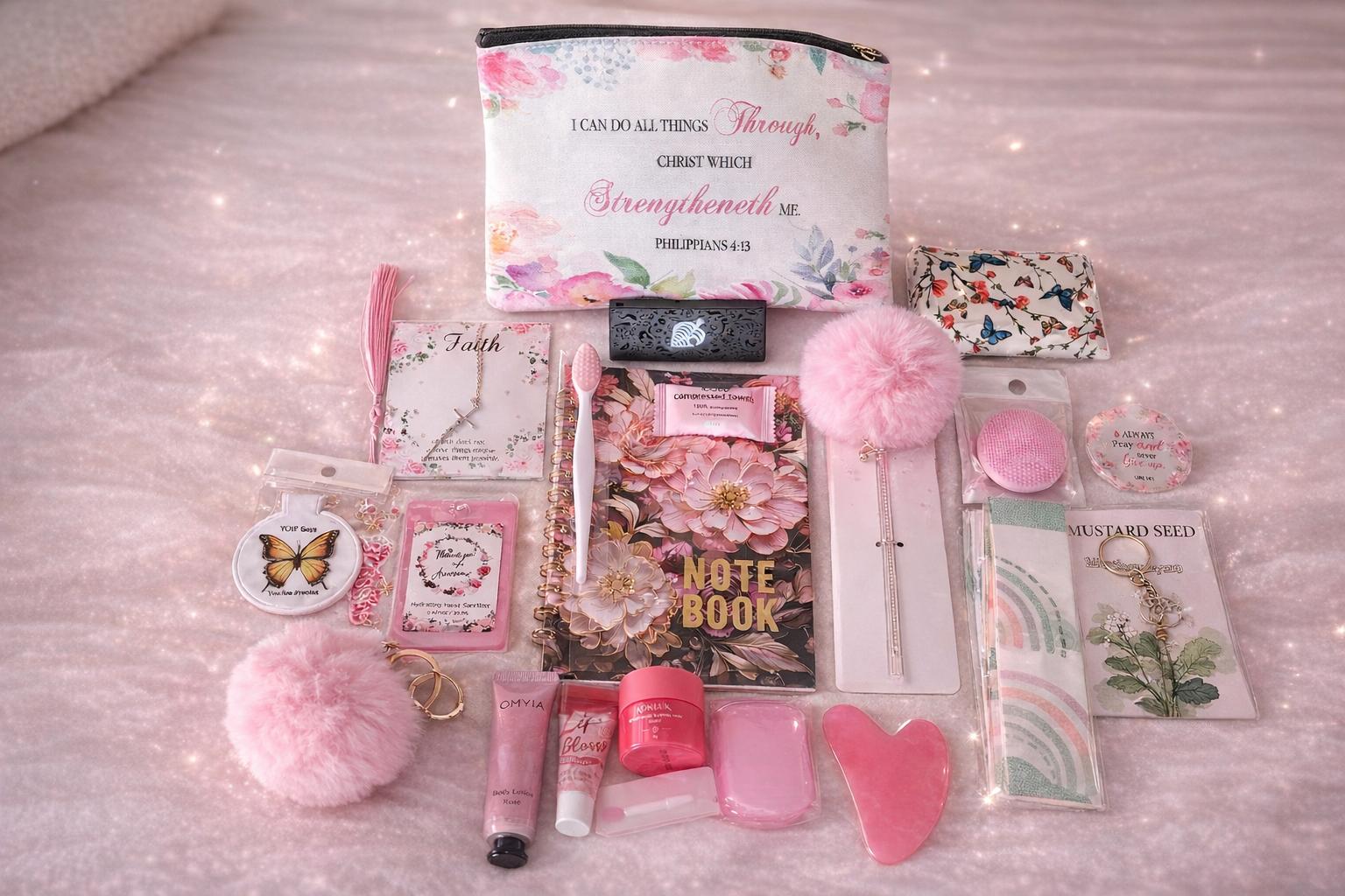 A beautifully curated collection designed to nourish your faith while caring for yourself — wherever life takes you. This collection blends practical self-care essentials with gentle spiritual reminders, creating moments of peace, confidence, and encouragement throughout your day. It comes in different colors; every bag is not the same.